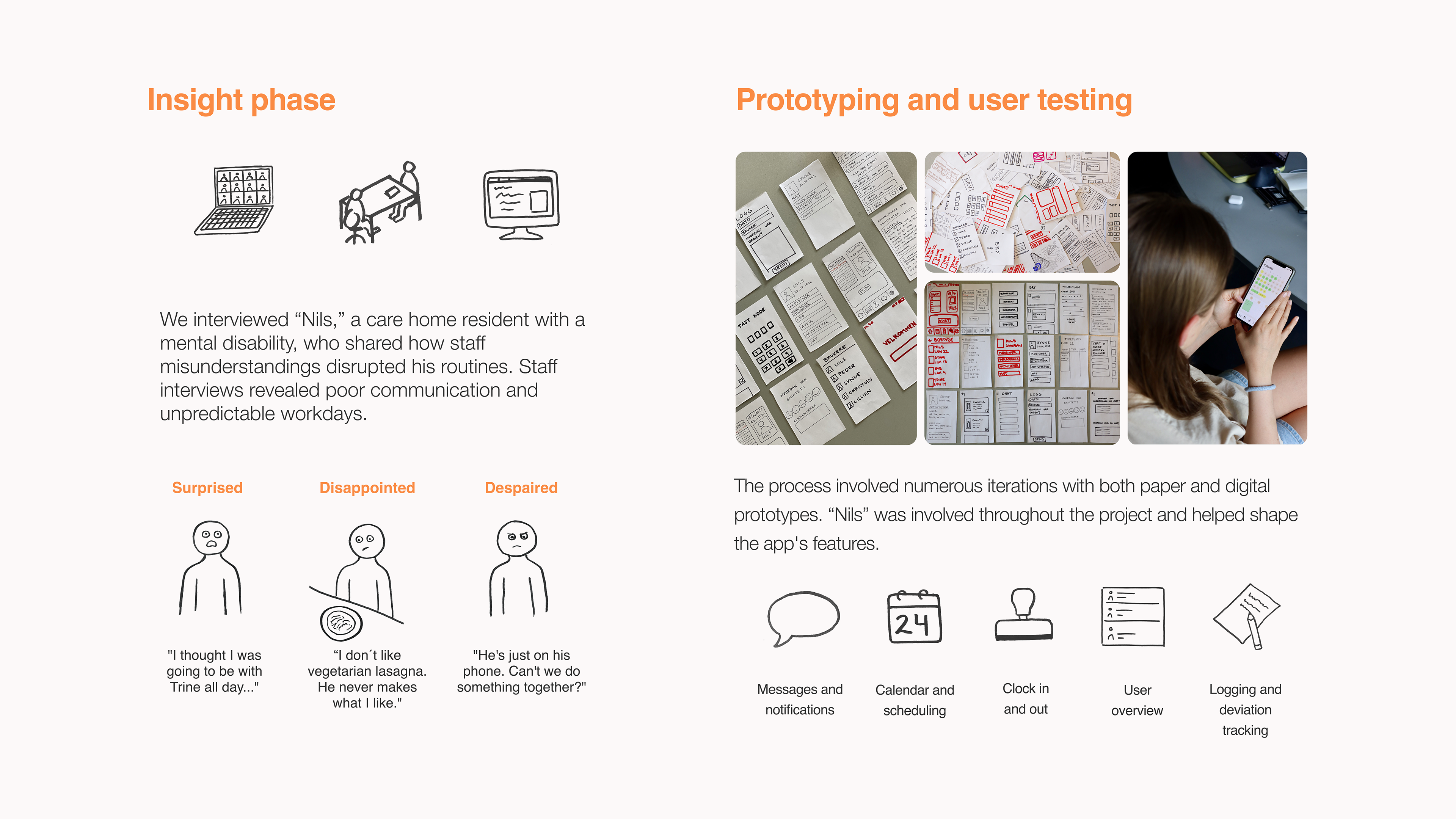 This project sparked my journey into design by introducing me to a creative, human-centered way of working. During the process we held qualitative and quantitive interviews with both residents and staff, and learned more about how to handle sensitive information.