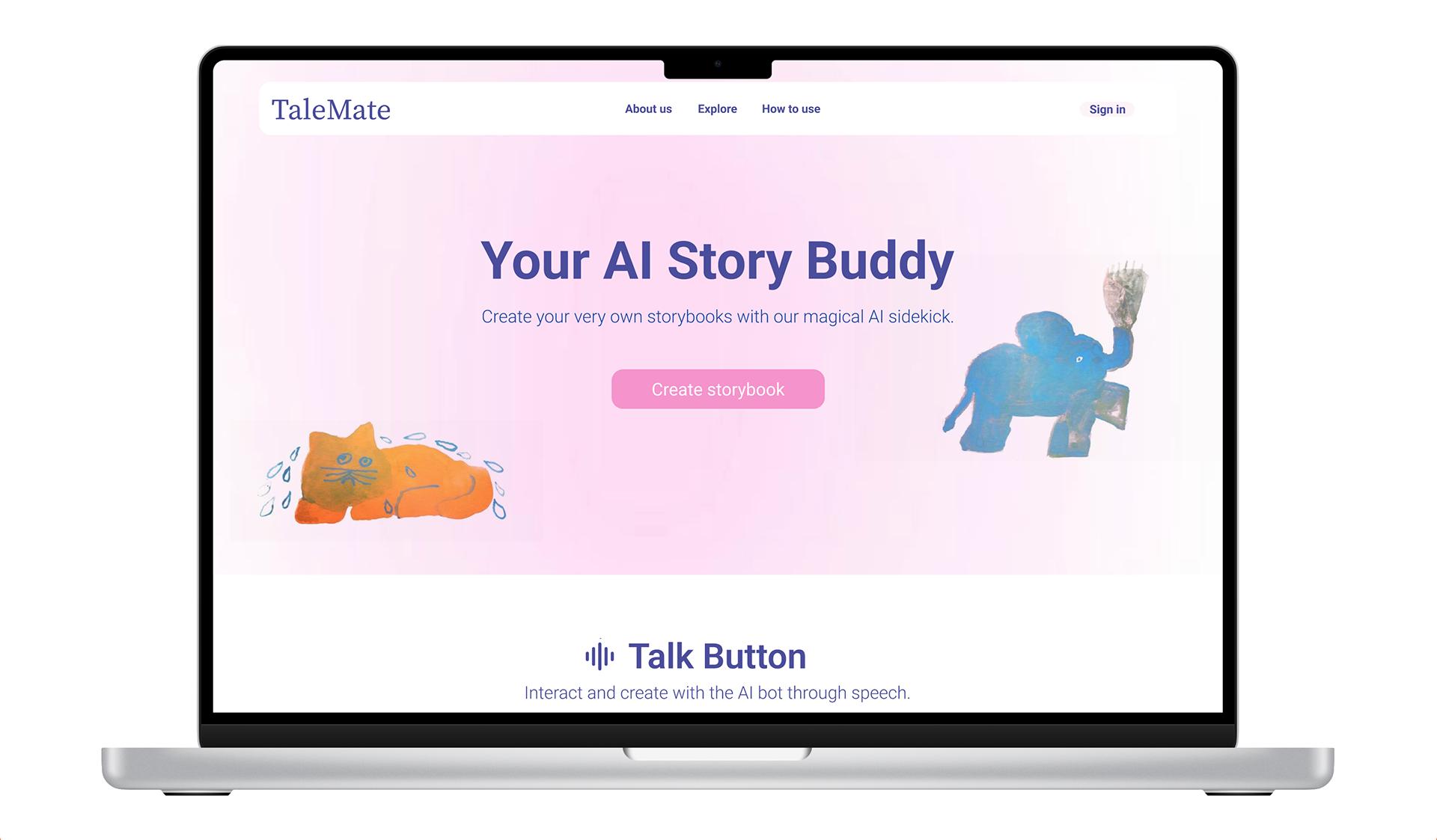 TaleMate is a storytelling site where AI narrates while you guide the adventure. Add drawings, photos, or stickers with your favourite characters, then save, edit, and share your stories on your personal bookshelf.